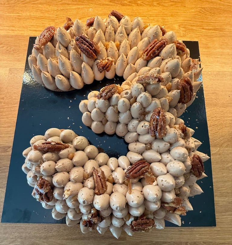 Ce Number Cake est composé d’une pâte sucrée croustillante découpée en forme de chiffre, sur laquelle repose un crémeux aux noix de pécan et un caramel demi-sel à la texture fondante et généreuse. L’ensemble est recouvert d’une chantilly au chocolat au lait, légère et subtil, pochée en gouttes régulières pour créer un volume harmonieux et élégant.